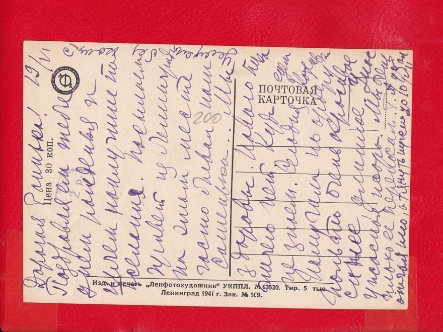 Описание открытки: Изд. и печать "Ленфотохудожник" УКППЛ. М 63520. Тир. 5 тыс. Ленинград 1941 г. Зак. №109. Цена 30 коп.