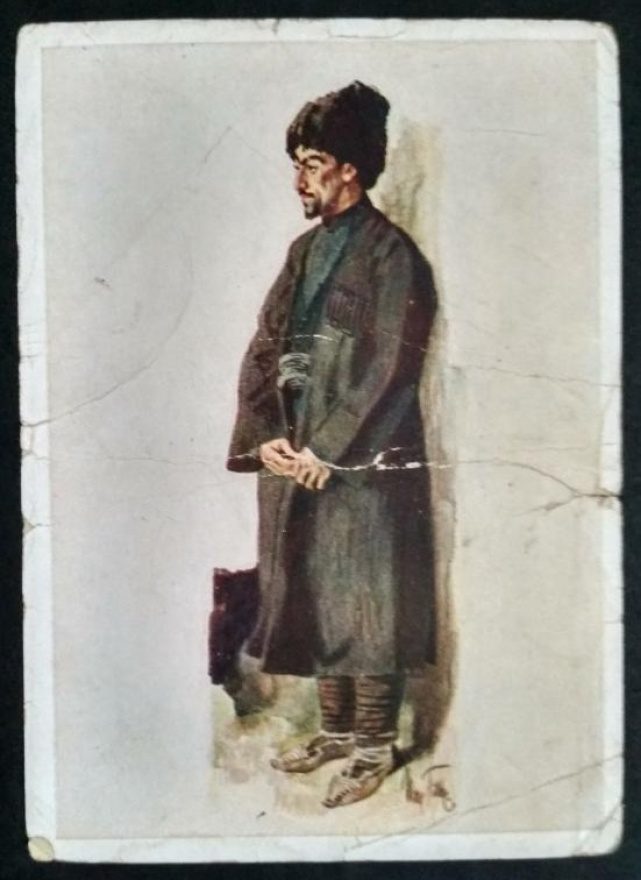 Описание картинки: Народы Кавказа в национальных костюмах. Удин из Нухи. Худ. М.Тильке. 1910 г.