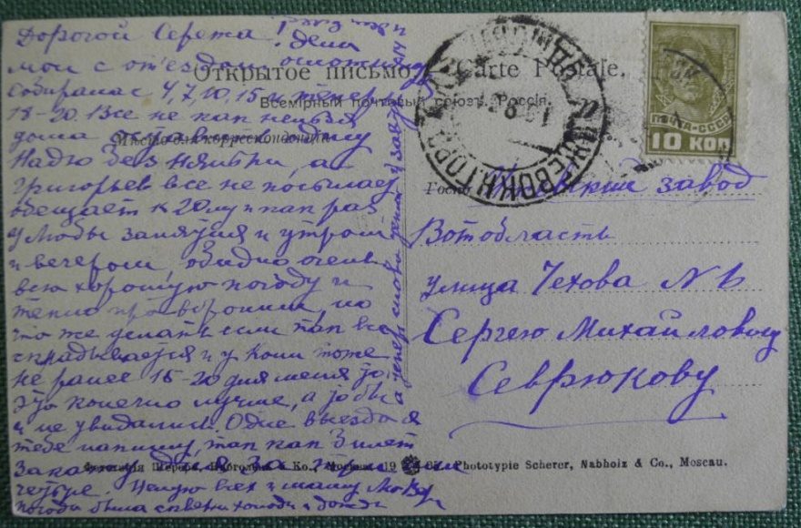 Дорогой Серёжа! Дела мои с отъездом осложнились. Собиралась 4, 7, 10, 15 и теперь 18-20 . Всё же так нельзя дома оставлять одну Надю без няньки, а Григорьев всё не поспевает, обещает к 20му как раз. У Люды занятия и утром, и вечером. Очевидно они всю хорошую погоду и тепло проворонят, но что же делать, если так всё складывается и у Коли тоже не ранее 15-20. Для меня то это конечно лучше, а то бы и не увиделись. О дне выезда я тебе напишу, так как билет закажу дня за три или четыре. Целую всех и маму Погода была скверная холод и дождь. {а теперь снова [нрзб] зовут [нрзб] 14 идём в лес.}