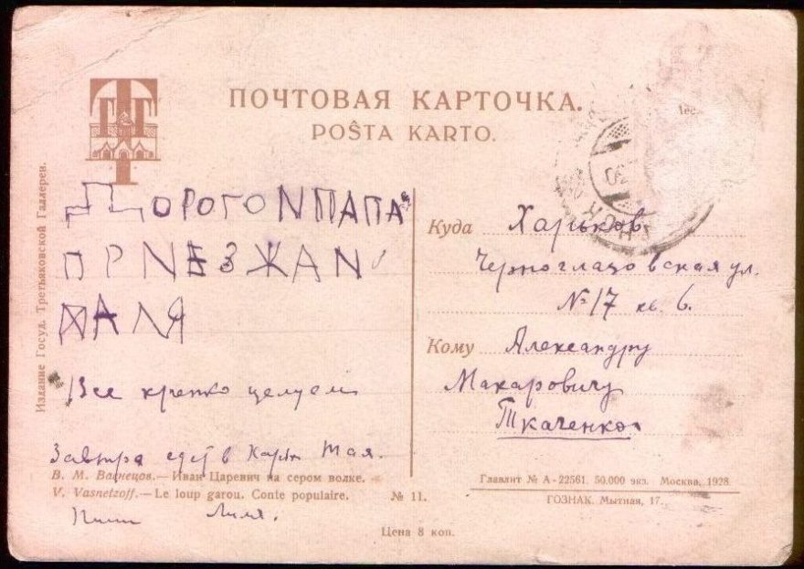 Описание открытки: Издание Госуд. Третьяковской Галереи. №11. Главлит № А - 22561. 50.000 экз. Москва. 1928. Гознак. Мытная 17. Цена 8 коп.