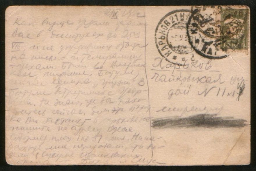 Как видите ждали Вас в Ессентуках до 25го VIII и не дождались [ото..] на [нрзб.] и [тем.ра..у] уехали. Были во [.лоз...] Тифлисе, Батуми, сейчас едем на "Грузии". В Батуми встретились с [нрзб.]. Не знаю, где вы находитесь сейчас. Если открытка вас застанет в Харькове напишите по адресу Одесса Соборная площ 1 кв 31 - еще. [?напишите] мне [нрзб.], что видели в [С.е.рне] [....ковских]. Пока Боря и [нрзб.]