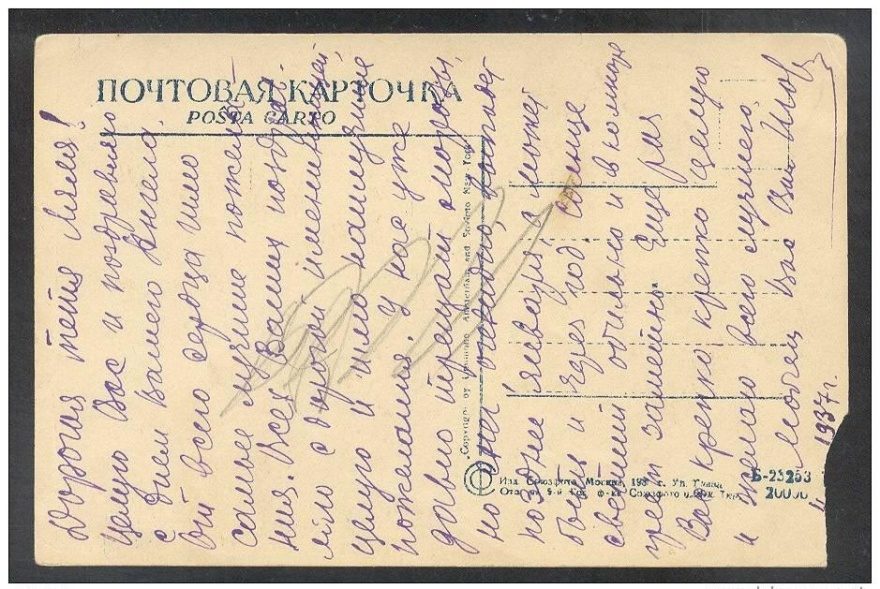 Дорогая тетя Ляля! Целую вас и поздравляю с днем Вашего Ангела. От всего сердца шлю самые лучшие пожелания. Всех Ваших поздравляю с дорогой именинницей, целую и шлю наилучшие пожелания. У нас уже давно трещат морозы, но снег, очевидно, выпадет позднее января, а может быть и через год. солнце светит обильно и в комнате грееет заметно. ещё раз Вас крепко, крепко целую и желаю всего лучшего.Любящий Вас 1937