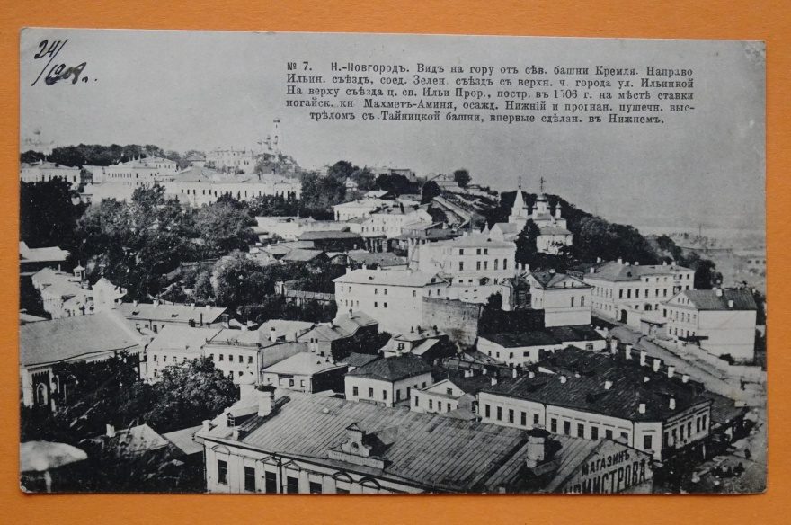 Описание картинки: №7. Н. - Новгород. Вид на гору от св. башни Кремля. Направо Ильин. сьезд, соед. Зелен. сьезд с верхн. ч. города ул. Ильинской. На верху сьезда ц. св. Ильи Прор., постр. в 1506 г. на месте ставки ногайск. к Махмет - Аминя, осажд. Нижний и [?пройнан.] пушечн. выстрелом с Тайницкой Башни , впервые сделан. в Нижнем.