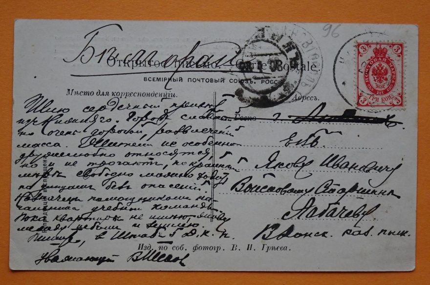 {} Шлю сердечный привет из Нижнего. Город славный но очень дорогой, развлечений масса. [?жители] не особо дружелюбно относятся, но и не трогают, по крайней мере свободно можно [? ходить] по улицам без опасений. Назначен помощником начальника учебной команды. Пока квартиры не [?ищью[^ищу]] живу между небом и землею[^землей]. Пиши в штаб 5 Д. К. [?Н]. Уважающий [В...] {24/1908 г[од]}
