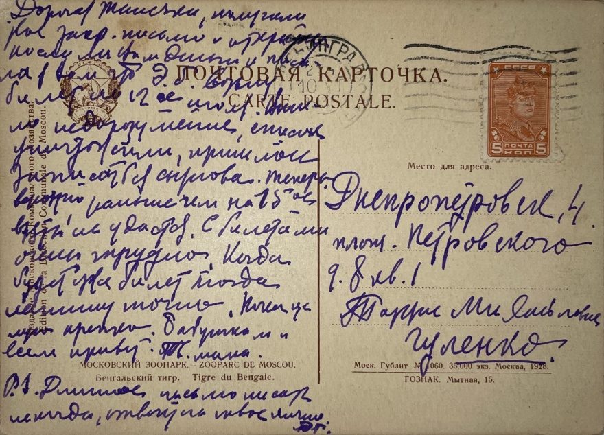 Дорогая Танечка, получили твое закр[ытое] письмо и открытку, [?послали] вам [нрзб.] и послала 1 вам [нрзб.] д[олжно] б[ыть] возьму билет на 12 ое июля. Вышло недоразумение, список уничтожили, пришлось записаться снова. Теперь вероятно раньше чем на [?18-ое] взять не удастся. С билетами очень трудно. Когда будет [?уже] билет тогда напишу точно. Пока целую крепко. Бабушкам и всем привет. Т[?воя] мама. P[ost] S[criptum] Длинное письмо писать некогда, [?отправь] твое лично. Д. Г.