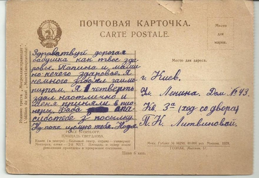 Описание открытки: Моск. Гублит. № 38290. 40.000 экз. Москва. 1929. ГОЗНАК. Мытная, 17