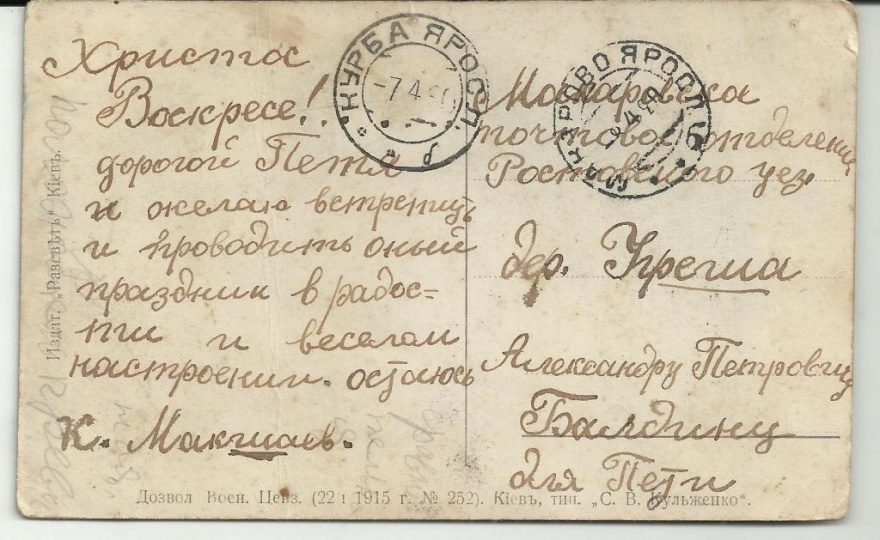 Христос Воскресе! …… дорогой Петя и желаю встретить и проводить оный праздник в радости и весёлом настроении. остаюсь К. Макшаев.
