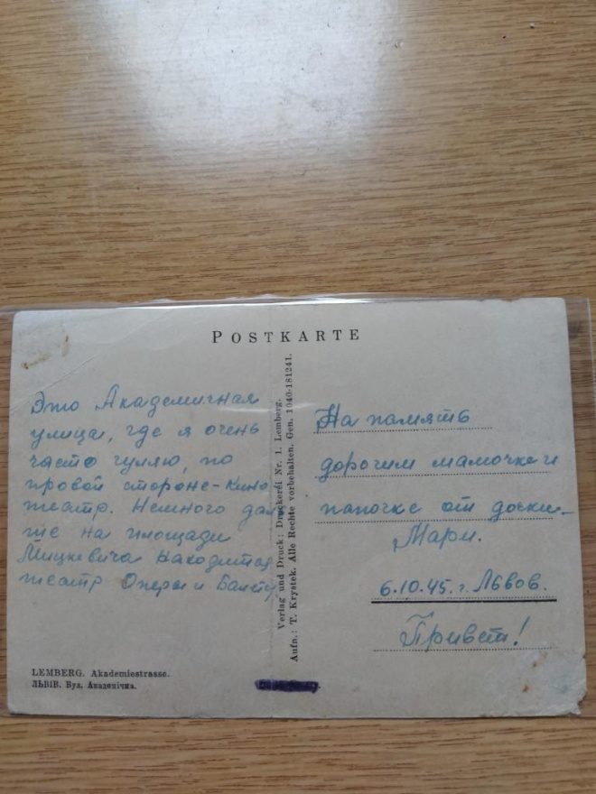 На память дорогим мамочке и папочке от дочки Мари. 6.10.45. г. Львов. Привет!