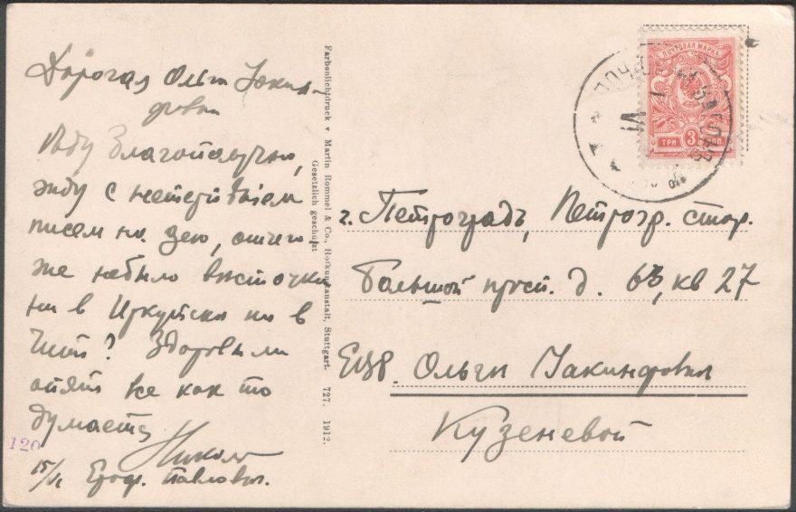 Дорогая Ольга Якинфовна. Еду благополучно, жду с нетерпением писем не знаю, от чего же небыло [^не было] весточки ни в Иркутске ни в Чите? Здоровы ли ай яй все как то думается. 15/IV. Никол. Ероф. Павлов.