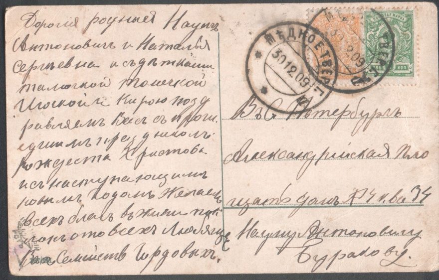 Дорогие родные Наум Антонович и Наталья Сергеевна и с детишками Тамочкой [^Томочкой] Тонечкой Иючкой и Кирою поздравляем Вас с прош. единым праздником Рождества Христова и с наступающим новым Годом Желаем всех благ в жизни поклон ото всех любящих Вас Семейств Гордовых. {от Бори сестре Гали [^Гале]} {Нижайший поклон Н. И. Бормоно[в]}