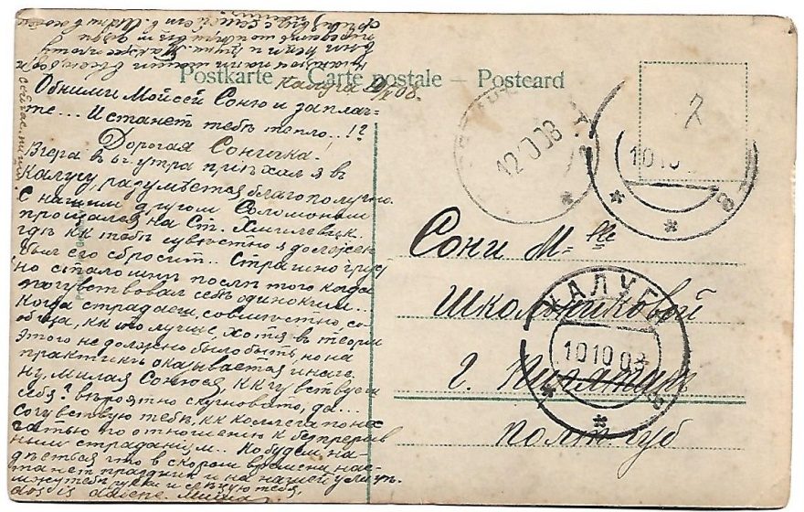 {Калуга 9/X 08.} Обними Моисей Соню и заплачте [^заплачьте]... И станет тебе тепло...!? Дорогая Соничка [^Сонечка]! Вчера в 6 ч[асов] утра приехал я в Калугу, разумеется, благополучно. С нашим другом Соломоном прощался на Ст[анции] Хмелевск[ой] где кк [^как] тебе известно я должен был его сбросить... Страшно грустно стало мне после того когда почувствовал себя одиноким... Когда страдаеш [^страдаешь] совместно, сообща, кк [^как]-то лучше, хотя в теории этого не должно было быть, но на практике оказывается иначе. Ну, милая Сонюся, кк [^как] чувствуешь себя? Вероятно скучновато, да... Сочувствую тебе, кк [^как] коллеге по несчастью по отношению к безпрерывным [^беспрерывным] страданиям... Но будем надееться [^надеяться] что в скором времени настанет праздник и на нашей улице. dos is daiene Миша {Кланяюсь папе маме Евсею, Боре Ене Пете и Туни [^Туне]. Также прошу передать мой привет дяде Филя вм[есте] с семейств[ом]. Мани [^Мане] в особенности. {сейчас. пиши.}