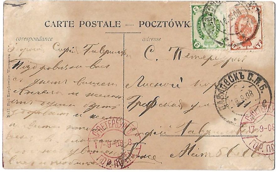 {17 сентяб. 1908 Оля} Дорогая София Гавриловна Поздравляю вас с днем вашего Ангела и желаю от души быть здоровым и желаю провести этот день в благополучии в [...н...с] уважающая вас и [?любящая] [?Оля]