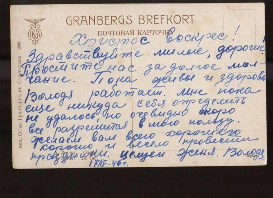 Простите нас за долгое молчание. Пока живы и здоровы. Володя работает. Мне пока еще никуда себя определить не удалось, но очевидно скоро все разрешится в мою пользу. Желаем вам всего хорошего. Хорошо и весело провести праздники. Целуем Женя. Володя.