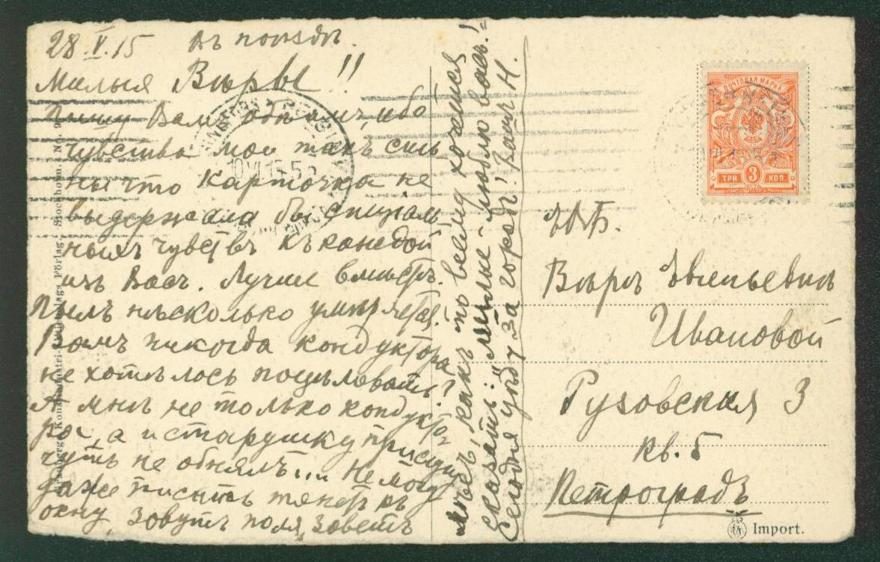 Пишу Вам обеим, ибо чувства мои так сильны что карточка не выдержала бы специальных чувств к каждой из Вас. Лучше вместе. Пыл несколько умеряется. Вам никогда кондуктора не хотелось поцеловать? А мне не только кондуктора, а и старушку прислугу чуть не обнял... Не могу даже писать тянет к окну, зовут поля, зовет {лес, как то [^как-то] всему хочется сказать: "Милые - люблю вас!" Сегодня уеду за город! Ваш Н.}