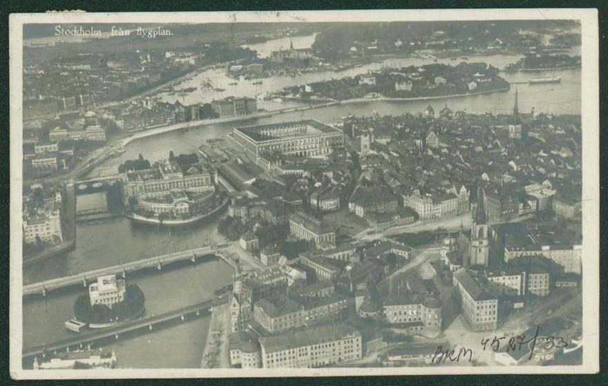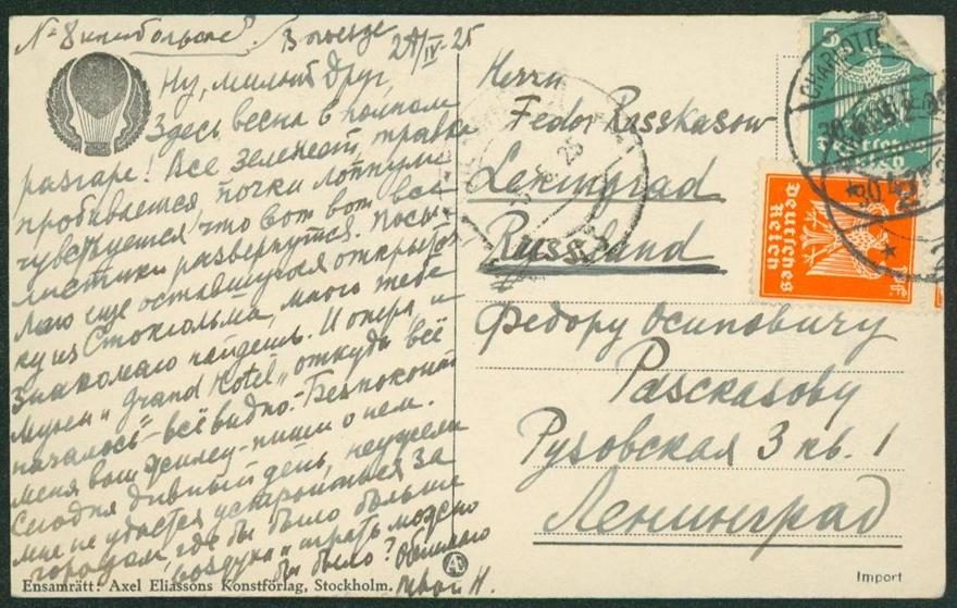 Здесь весна в полном разгаре! Все зеленеет, травка пробивается, почки лопнули, чувствуется что вот вот все листики развернутся. Посылаю еще оставшуюся открыточку из Стокгольма, много тебе знакомого найдешь. И опера и музеи и Grand Hotel, откуда все началось - все видно. Беспокоит меня ваш жилец - пиши о нем. Сегодня дивный день, неужели мне не удастся устроиться за городом, где бы было больше воздуха и играть можно бы было? Обнимаю