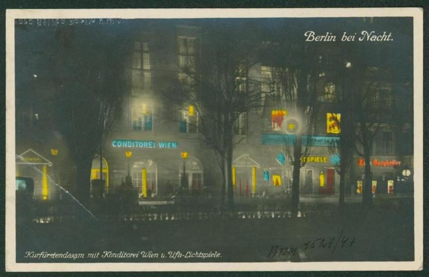 Описание картинки: Berlin bei Nacht Kurfürstendamm mit Konditorei Wien u. Ufa-Lichtspiele.