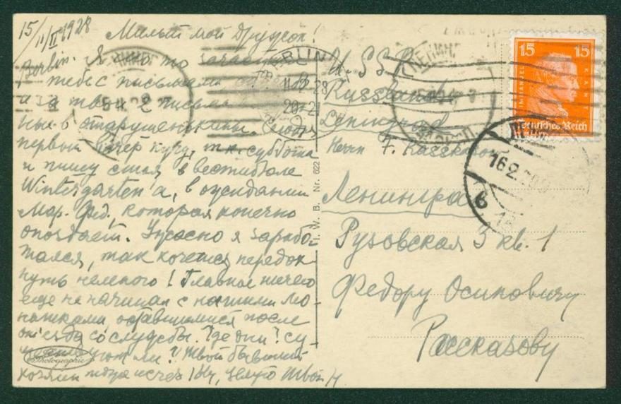 {15/ 11/II 1928 Berlin} Милый мой Дружок! Я шо то [^что-то] зачастил тебе с письмами, спасибо и за твои 2 письма [?отправленныеные] в [?старушенькины]. Сегодня первый вечер [?хожу], т.к. суббота и пишу стоя в вестибюле Wintergarten'а, в ожидании Мар[?ии] Фед[?оровны], которая конечно опоздает. Ужасно я заработался, так хочется передохнуть немного! Главное нечего еще не начинал с нашими монаnками оставшимися после отъезда со службы. Где они? Существуют ли? Твой бывший хозяин тоже исчез! Ну, целую твой Н.