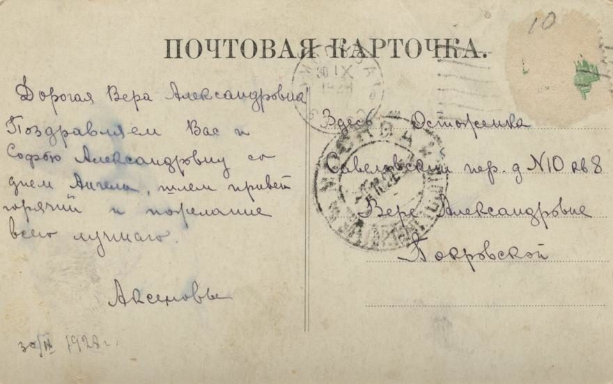 Дата отправления, штамп: 30 сентября 1928