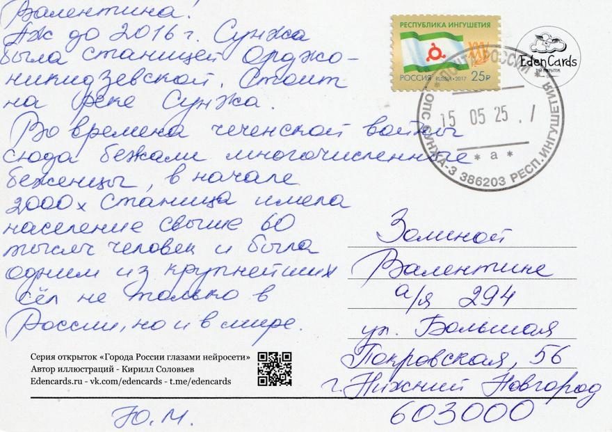 Валентина! Аж до 2016 г. Сунжа была станицей Орджоникидзевской. Стоит на реке Сунжа. Во времена чеченской войны сюда бежали многочисленные беженцы, в начале 2000х станица имела население свыше 60 тысяч человек и была одним из крупнейших сел не только в России, но и в мире.