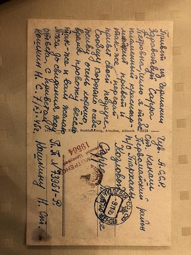 Привет из Германии Здравствуй Сарра Петровна, шлю я тебе пламенный красноармейский привет и так-же[^так же] передай привет своей подруге. Сообщу коротко о себе: живу очень хорошо, время провожу весело так-же[^так же] и вам желаю Пока до свидания жду ответа. С приветом Кошкин Н. С. 7/XI -45г.