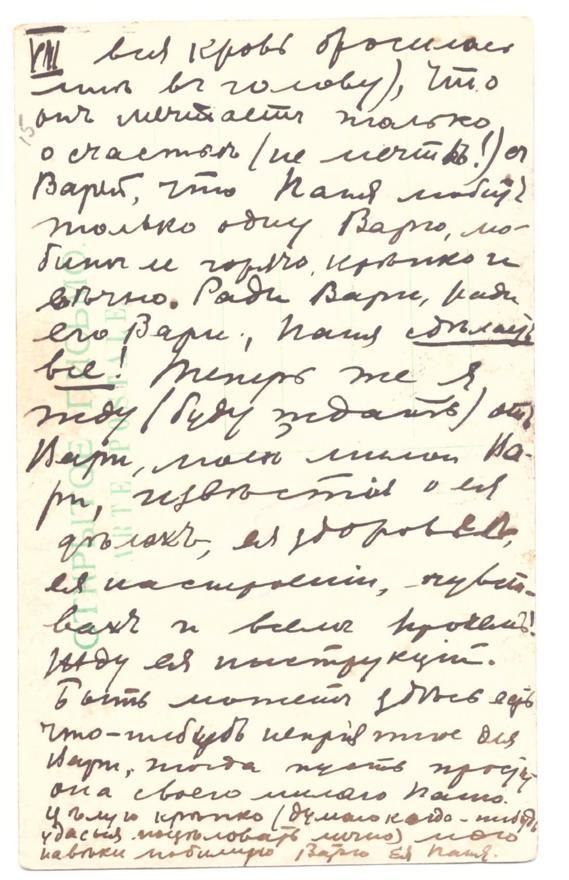 вся кровь бросилась мне в голову), что он мечтает только о счастье (не мечте!) с Варей, что Паня любит только одну Варю, любит ее горячо, крепко и вечно. Ради Вари, ради его Вари, Паня сделает все! Теперь же я жду (буду ждать) от Вари, моей милой Вари, известия о ее делах, ее здоровье, ее настроении, чувствах и всем прочем! Жду ее инструкций. Быть может, здесь есть что-нибудь неприятное для Вари, тогда пусть простит она своего милого Паню. Целую крепко (думаю когда-нибудь удастся поцеловать лично) мою навеки любимую Варю. Ее Паня