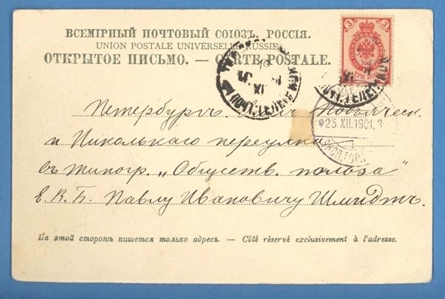 Куда: Петербург. Угол Подьяческ[ой] и Никольского переулка в типогр[афию] "Обществ[енная] польза"