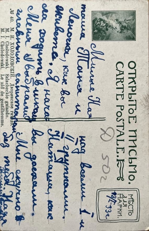 Милые Наташа Таня и Леночка, как вы живете. Я начала ходить в школу. Меня выбрали главным санитаром над всеми I и II группами. Наташа, как вы доехали. Мне скучно в без тебя. Надя Вишневская