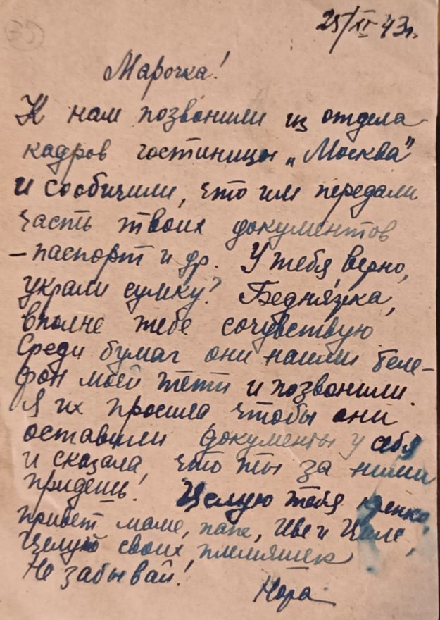 К нам позвонили из отдела кадров гостиницы "Москва" и сообщили, что им передали часть твоих документов - паспорт и др. У тебя, верно, украли сумку? Бедняжка, вполне тебе сочувствую. Среди бумаг они нашли телефон моей тети и позвонили. Я их просила, чтобы они оставили документы у себя и сказала, что ты за ними придешь! Целую тебя крепко, привет маме, папе, Иве и Циле, целую своих племяшек.