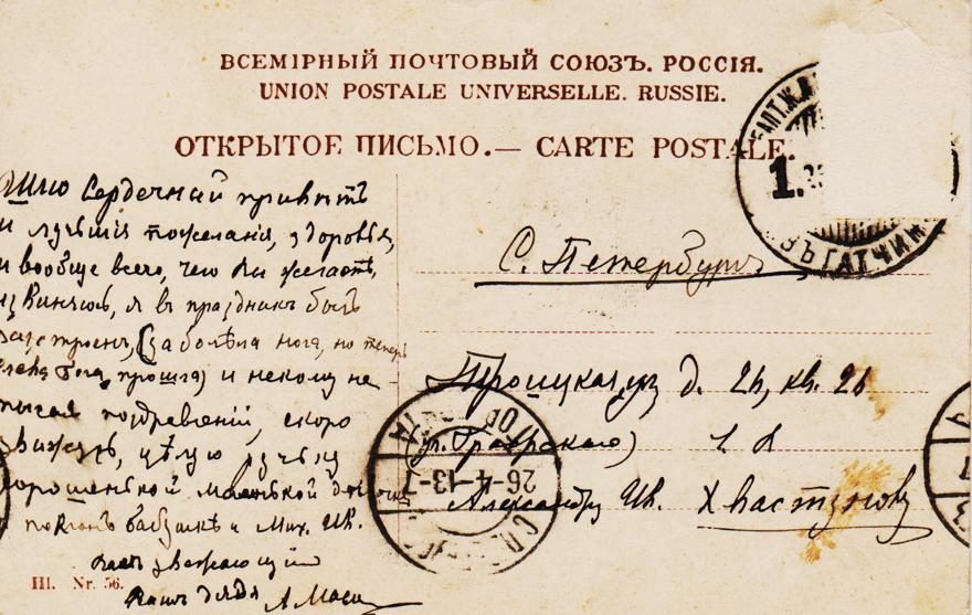 Куда: С[анкт-]Петербург Троицкая ул[ица] д[ом] 26, кв[артира] 26 (ул[ица] [?Графского]) 1 [нрзб]