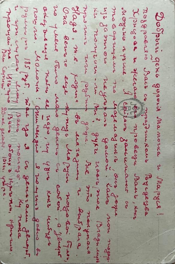 Поздравляю Вас с праздником Рождества Христова и желаю его провести Вам, как можно лучше. Я сейчас занимаюсь с товарищем по математике, он тоже из за [^из-за] этого не уехал домой. Как мои подарки получили-ли [^получили ли] Вы? духи наверное Владимир пролил или разбил даже. Все это покупала Надя, т[о] е[сть] ходила в магазин и выбрала. Она велела еще купить Марусе почтовой бумаги, но у меня было мало денег с собой, а теперь оказывается тебе ее надо, ну уж как нибудь [^как-нибудь] пошлю. Мамочка! Стипендию я получил давно в размере 185 руб[лей] так что я с деньгами теперь, и при случае могу Вам послать. Ну пока прощайте. Целую Вас обоих крепко, крепко.