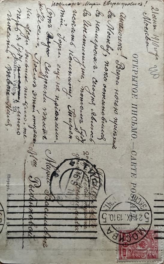 Ангелочек! Вчера ночью приехал в Москву, пока остановился в номерах. Сегодня явлюсь в Институт, потом буду искать комнату. Тирентий [^Терентий], [Юр..] еще не приехали. От Ряза Сызрани ехать было весело. После этой открытки жди большое письмо. теперь я буду писать много писать. Твой [?Каля].