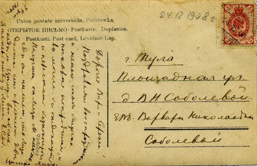 Дата отправления, штамп: 24 декабря 1908