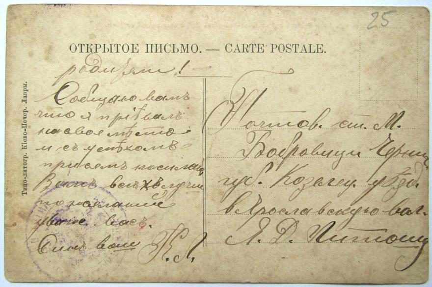 Куда: Почтов[ая] ст[анция] М[естечко] Бобровици [^Бобровица] Черниг[овская] губ[ерния] Козелец[кий] уезд. Ярославская вол[ость]