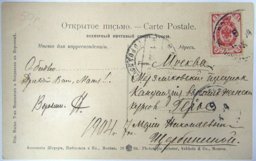 Описание открытки: Изд. Магаз. Т-ва Молчанов и Богданов в Воронеже. Фототипия Шерер, Набгольц и Ко., Москва. 1904. Phototypie Scherer, Nabholz & Co., Moscou.