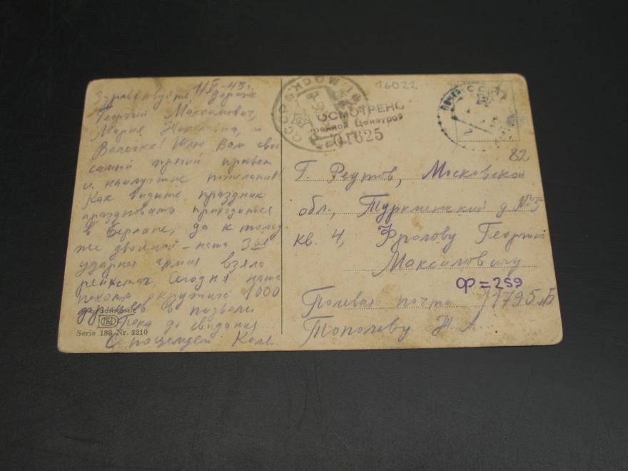 Здравствуйте, дорогие Георгий Максимович, Мария Николавна [^Николаевна], и Валечка! Шлю Вам свой самый горячий привет и наилучшие пожелания! Как видите праздник праздновать приходится в Берлине, до к тому же двойной - наша 3-ья ударная армия взяла рейхстаг. Сегодня наша пехота окружила 1000 фрицев в подвале.