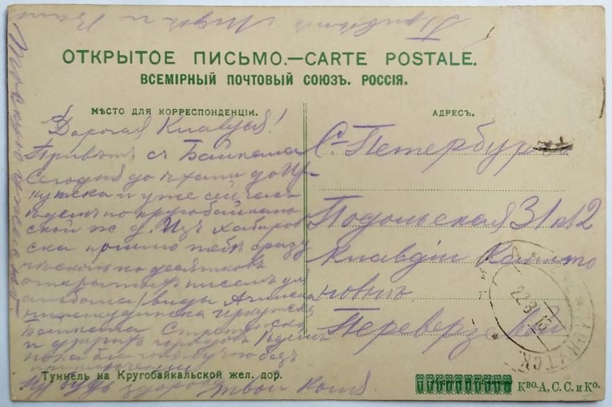 Сегодня доехали до Иркутска и уже сейчас едем по кругобайкальской ж[елезной]. д[ороге]. Из Хабаровска пришлю тебе сразу несколько десятков открытых писем для [нрзб] виды Ачинска, Нижнеудинска Иркутска Байкала Стретенска [^Сретенска] и других городов. Едем пока благополучно без приключений.