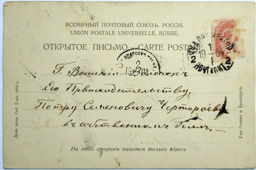 Описание открытки: Т-во Голике и Вильборг. Дозв. ценз. Спб. 2 авг. 1903 г.