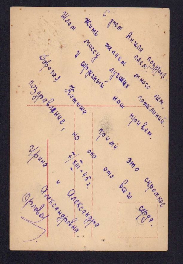 С днём ангела поздравляем! Жить желаем много лет. Шлём массу лучших пожеланий. И сердечный наш привет. Дорогая Катюша, прими это скромное поздравление, но оно ото[^от] всего серда [^сердца]. 7/XIII - 45 г. Ирина и Александра Александровна Орловы.
