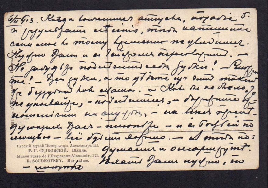 6/II 1903 [*1913] Когда [во…] [ат…] [нрзб] 5. И […рать ] [нрзб], тогда напишите сами мне к тому времени не увидишь. [?Нужно] […лт] и [нрзб] [трос…]. - Не забудьте подлечить себе зубки! – […те!] – [нрзб] зубки, а то уедете из [нрзб] такими же беззубыми как мама. Как бы не было, не унывайте, - [П…т…], - [бод…те] [нрзб] [ноше…] им [слу…], - их [нрзб] Долг [нрзб] - все будет хорошо. – А [нрзб] подумаешь и о маршруте. […ть] [нрзб]