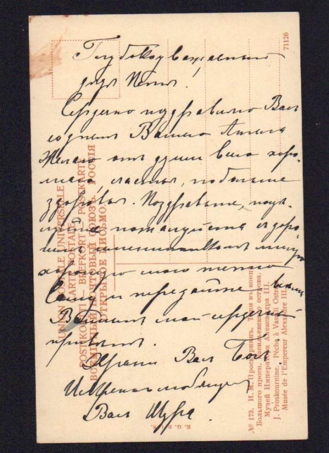 Глубокоуважаемый дядя Петя! Сердечно поздравляю Вас с днем Вашего Ангела Желаю от души всего хорошего, счастья, побольше здоровья. Поздравьте, поцелуйте пожалуйста с дорогим именинником милую, хорошую мою тетю Сашу и передайте всем Вашим мой сердечный привет. Храни Вас Бог. Искренне люблю Вас Шура.