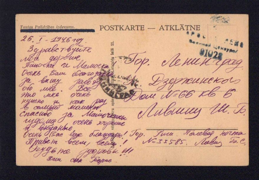 Здравствуйте мои дорогие Папочка и Мамочка! Очень Вам благодарен за вашу заботу обо мне. Все это мне очень нужно и как раз в самый момент. Спасибо за Мамочкины изделия, очень хорошие и вкусные. Очень Вас еще благодарю! Привет всем, всем! Будьте здоровы!!! Ваш сын Борис