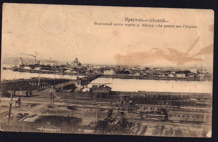 Описание картинки: Иркутск. Понтонный мост через р. Ангару. Irkoutsk. Le ponton sur l'Angara/