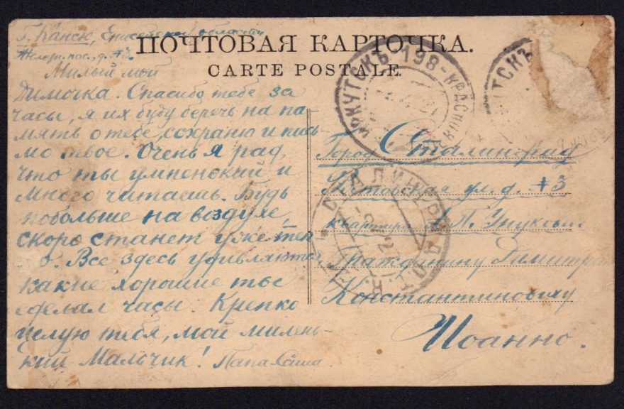 {Г. Канск Енисейской области, Железн. пос, д.№3} Милый мой Димочка. Спасибо тебе за часы, я их буду беречь на память о тебе, сохраню и письмо твое. Очень я рад, что ты умненький и много читаешь. Будь побольше на воздухе, скоро станет уже тепло. Все здесь удивляются, какие хорошие ты сделал часы. Крепко целую тебя, мой миленький Мальчик! Папа-Саша