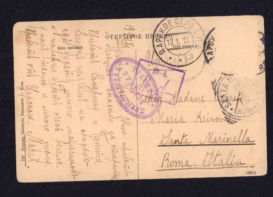 {12.01.1915} Душка Мауся. Шлю привет и большое спасибо за открытки. Привет Сандрику и Бетти. Сегодня гуляем на свадьбе где будет много мальчиков, и наверное будет очень весело. У нас тепло и много снегу [^снега]. Привет от Царского. Мария.