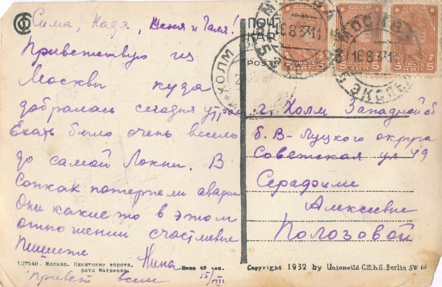 Сима, Надя, Женя и Галя! Приветствую из Москвы куда добралась сегодня утром. Ехать было очень весело до самой [?Лохни]. В Сопках потерпели аварию. Они какие то в этом отношении счастливые. Пишите Нина 15/8