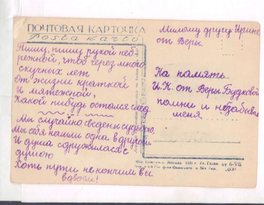 Пишу, пишу рукой небрежной, чтоб через много скучных лет От жизни краткой и мятежной, Какой нибудь остался след. Мы случайно сведены судьбою, Мы себя нашли одна в другой, И душа сдружилася с душою Хоть пути не кончим ви вдвоем! {Милому другу Ирине от Веры. На память И. К. от Веры Будковой помни и не забывай меня.}