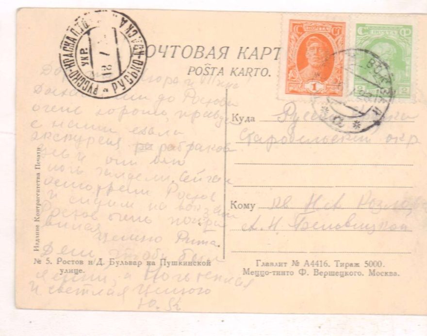 Дорогие Игора и Тина! Доехали мы до Ростова очень хорошо, правда с нами ехала экскурсия рабфаков . Усь и они всю ночь галдели. Сейчас осмотрели Ростов и сидим на вокзале. Ростов очень понравился. Целую Рита. День, чтобы был ясный, а ночь теплая и светлая. Целую Ю.К.