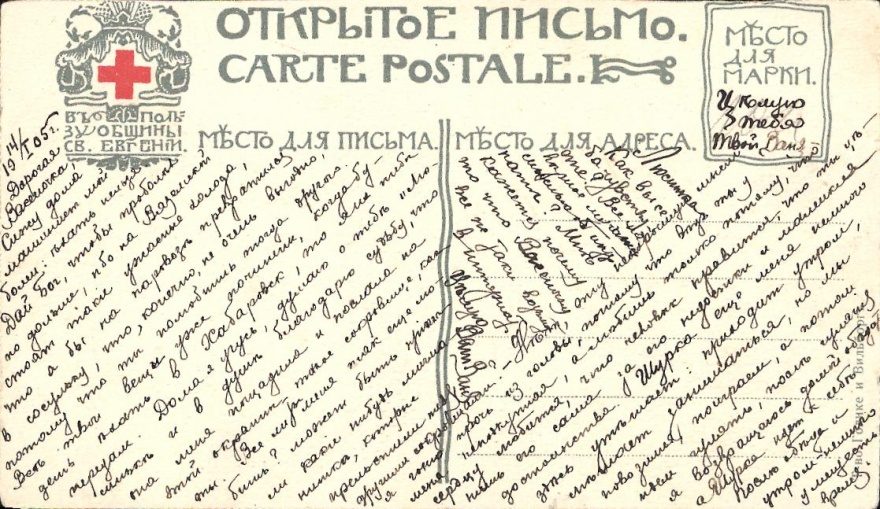 Все твои вещи уже починины, когда будешь плыть в Хабаровск, то яне тебе передам. Дома я учусь, думаю о тебе "[Лю...] и в душе благодарю судьбу, что та меня пощадила и послала на этой окраине такое сокровище, как ты. Все ли Вы меня так еще любите? может быть приезжали каки нибудь мальчишки, которые прельстили тебя другими сокровищами? - Этому эту нехорошую мысль я гоню прочь из головы, потому что это ты у меня непокупная, а любишь только потому, что сердцу любится, что человек нравится, что ты отнимешь его сама за его недостатки и молишься достоинства. Шурка еще меня зато утешает: приходит утром, [нрзб] заниматься, но мы повозимся, поиграем, а потом идем гулять, [нрзб] а Шурка идет к себе После обеда и утром - немного у меня есть время.