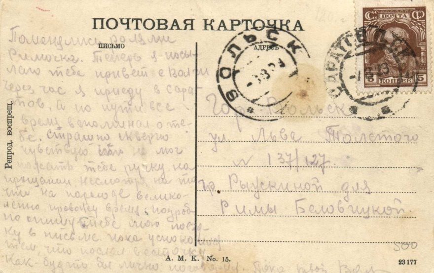 Поменялись ролями Римочка. Теперь я посылаю тебе привет с Волги Через час я приеду в Саратов, а по пути все время вспоминая о тебе. Страшно скверно чувствую что не мог пожать тебе ручку на прощании. Несмотря на то что на пароходе великолепно провожу время, подробно опишу тебе мою поездку в письме. пока успокоился тем, что послал весточку. Как-будто бы лично поговорил. Пока. Твой Вал.