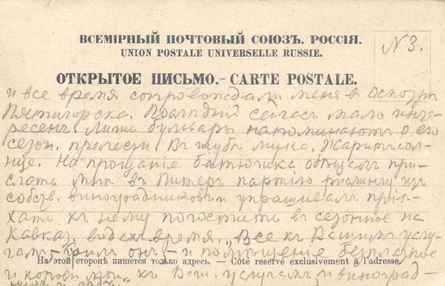 и все время сопровождали меня [нрзб] Пятигорска. Последний сейчас мало интересен. лишь бульвары напоминают о его сезон. прелести в шубе [нрзб]. Жарит солнце. Но [прогу...] батюшке обещал прислать мне в Питер партию [рис...] [нрзб] собств. виноградников и упрашивал прислать к нему погостить в сезонное на Кавказ. [нрзб] время. "Все к Вашим услугам, - Крым он, - и помещение бесплатное и кров мой" к Ваш. услугам и виноград - [нрзб]